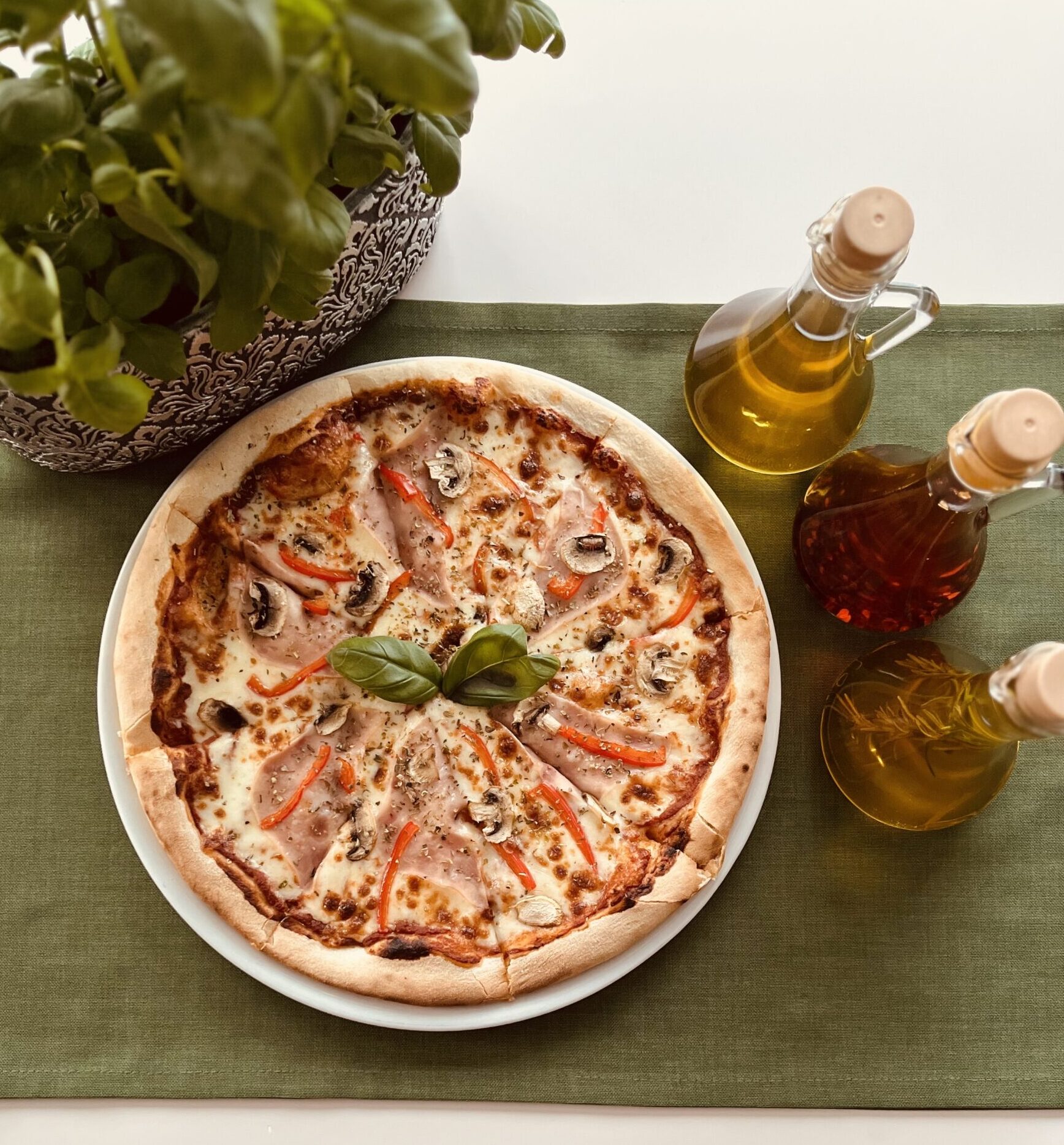 Sos pomidorowy, ser, szynka, pieczarki, papryka